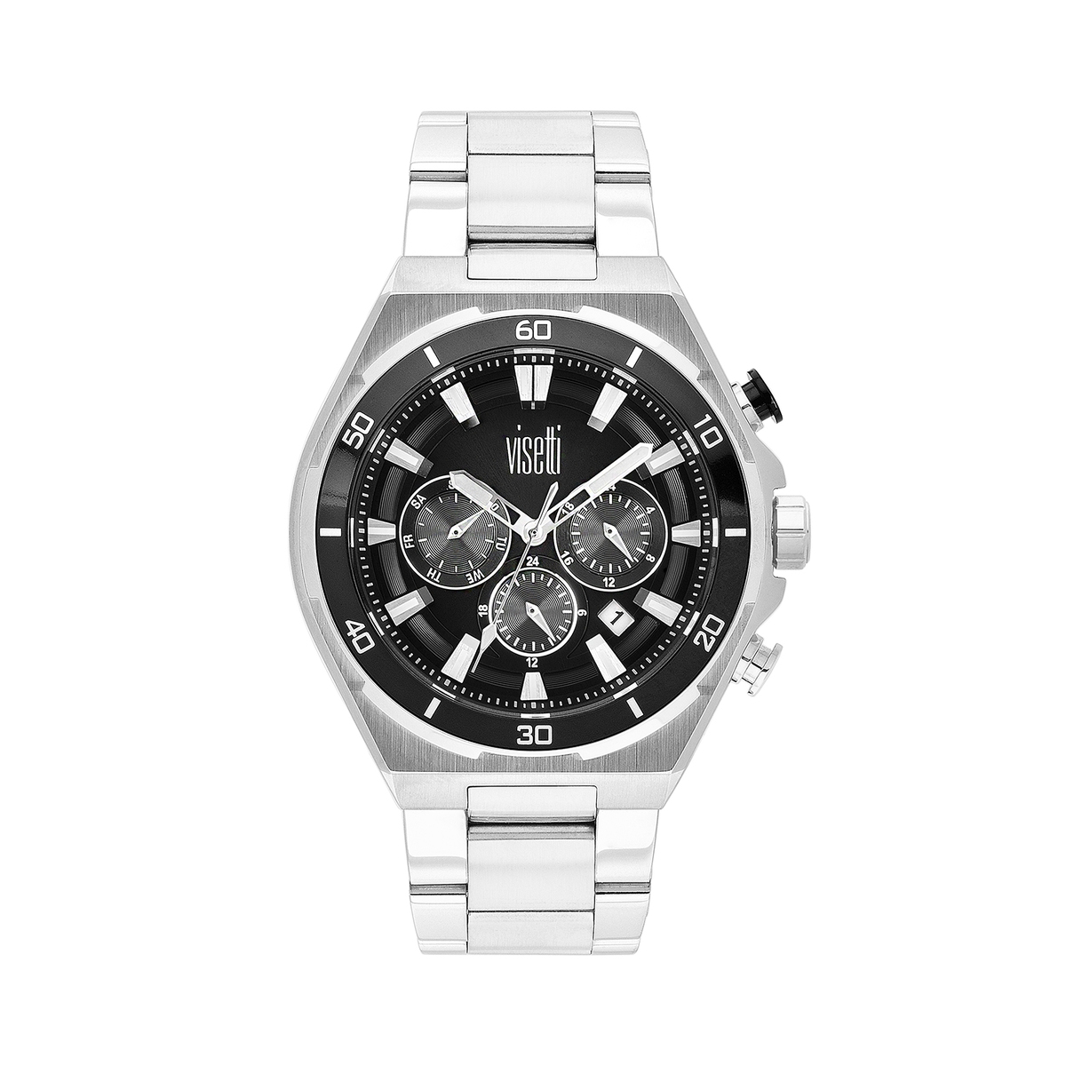 Ανδρικό ρολόι Vector της Visetti, με διάμετρο 45mm, αδιάβροχο 10 ATM, από ανοξείδωτο ατσάλι με μπρασελέ από ανοξείδωτο ατσάλι και μαύρο καντράν.