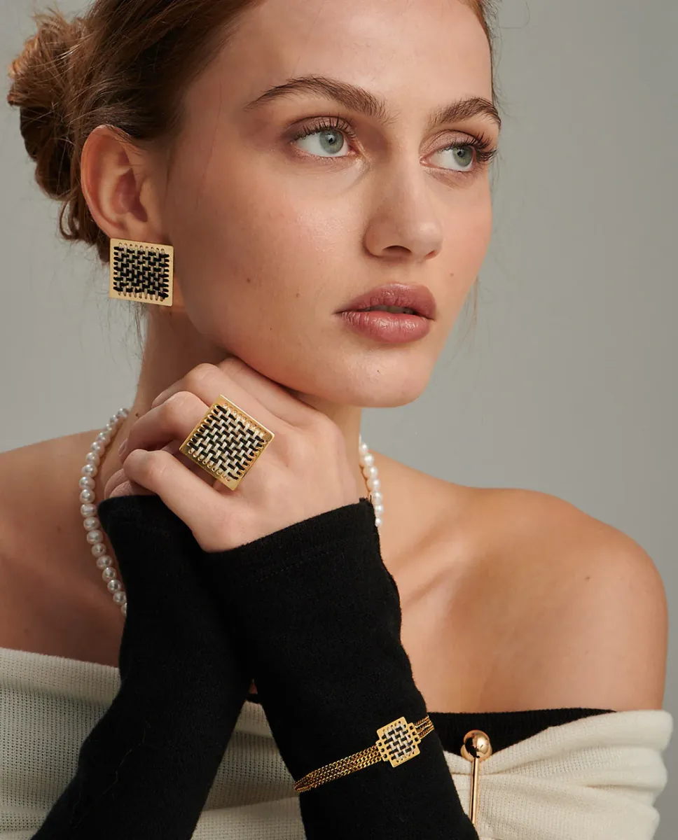 Handmade, square Tessera stud earrings, made of gold-plated brass, with brown thread embroidery. An earring that can accompany you from morning to night. Discover the rest of the jewelry from the "Kedima Collection" and create your own looks.