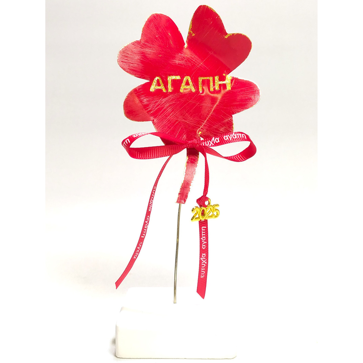 Χειροποίητο γούρι "Τετράφυλλο Τριφύλλι" με ευχή για αγάπη, φτιαγμένο από μπρούντζο, διακοσμημένο με κόκκινο σμάλτο, στηριγμένο πάνω σε βάση από ανασχηματισμένο μάρμαρο. Επίσης έχει προστατευτικό φίλτρο, ώστε να μένει αμετάβλητο στο χρόνο. Η κατασκεύή του είναι εξ' ολοκλήρου ελληνική.